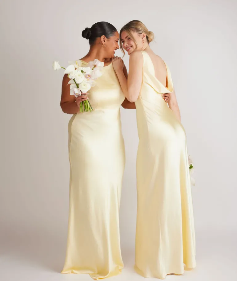 Melt in the mouth, golden Butter Lemon is sure to give your wedding pics a double take. We can see this colour in gardens to beaches. Our luxury and super high quality hammered satin twinkles so many hues rich lemon in the sun light, something very angelic about this colour. This is our most traditional take on bridesmaid dresses, this shape has a dramatic cowl back and boat neck. It is effortless, elegant and traditional in the same breath. We’ve added extra length in the bias skirt for taller bridesmaids or the highest of heels.