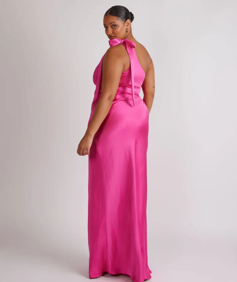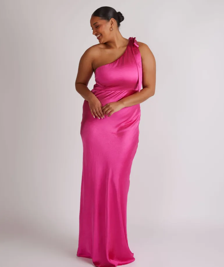 A head-turning statement in Fuchsia Pink, this dress is bold, sensual, and designed to steal the spotlight. The one-shoulder bow detail adds drama, while the luxury hammered satin catches the light beautifully, making for photography that truly stops you in your tracks. Perfect for the bride who wants her bridesmaids to radiate confidence.